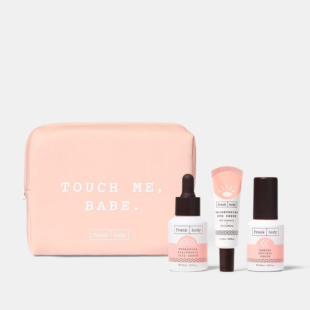 مع فرانك بودي مجموعة سيرومات الوجه عالج وجهك بمكونات العناية بالبشرة التي تضيء وترطب و تعودك عليه تشكل هذه المجموعة علاجا ثلاثيا لكل حالة جلدية تقريبا من الخطوط الدقيقة و حب الشباب إلى الهالات السوداء و البهتان. و تتكوم المجموعة من مصل تفتيح العينين 15 مل و مصل حمض الهيالورونيك المرطب 30 مل و مصل الريتينول 30 مل