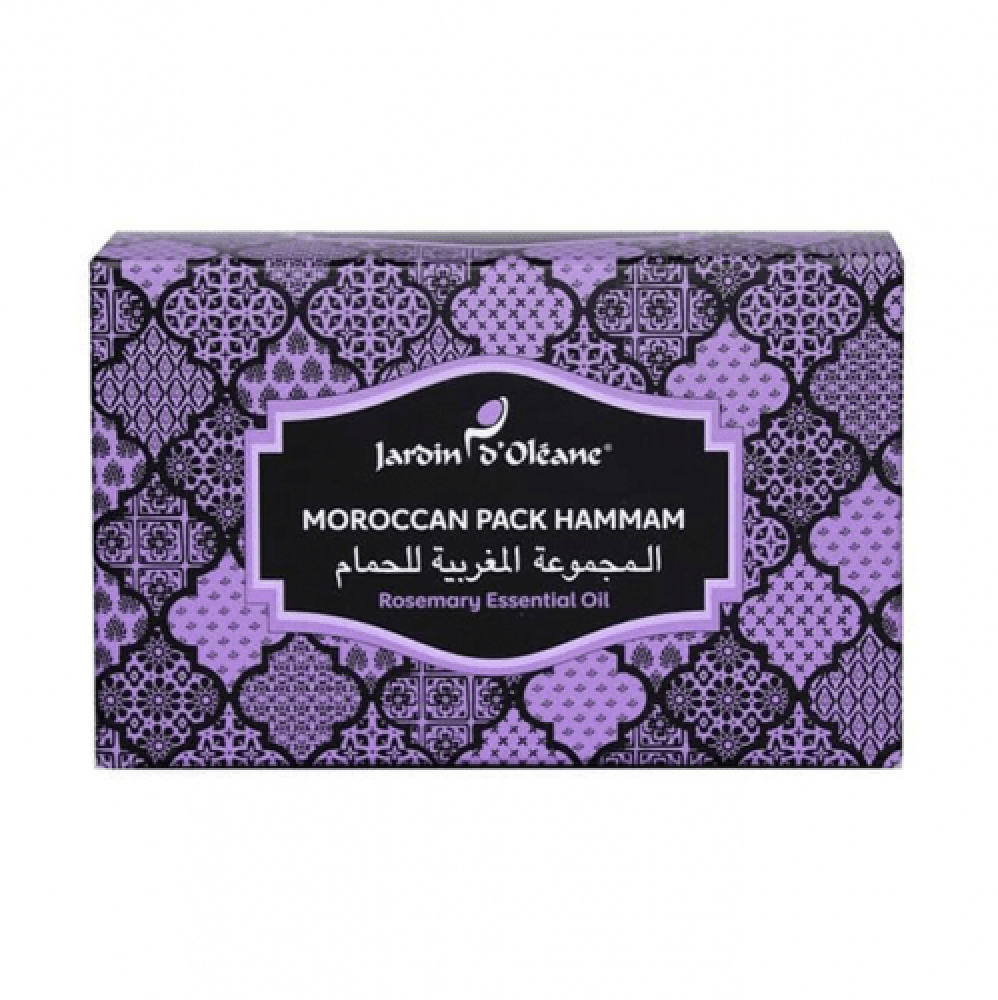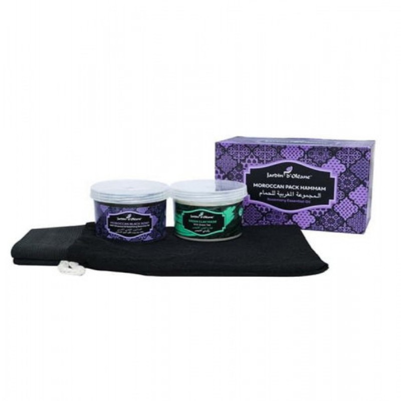 جاردن اوليان المجموعة المغربية للحمام بزيت اكليل الجبل الأساسي وقناع الطين الأخضر هي مجموعة النظافة الشخصية التي تعتبر مزيج من الفوائد التي ستنعم بها بشرتك و هي تحتوي على ليفة و و مقشر و قناع الطين