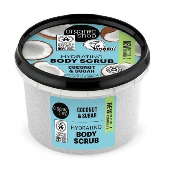 اورجانيك شوب مقشر للجسم بجوز الهند والسكر يساعد على تجديد و ترطيب البشرة بشكل فعال مع استعادة التوازن الطبيعي اضافة الى تقشير البشرة برفق وينعمها جيدا