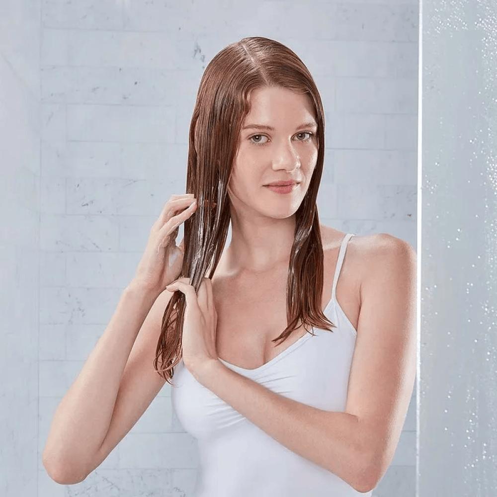 بعـد غسـل الشـعر بالشـامبو، أزيلي الماء الزائد وضعي البلسـم عـلى طول الشـعر، مـع تجنـب الجـذور، دلـكي بلطـف واشـطفيه جيـدا.