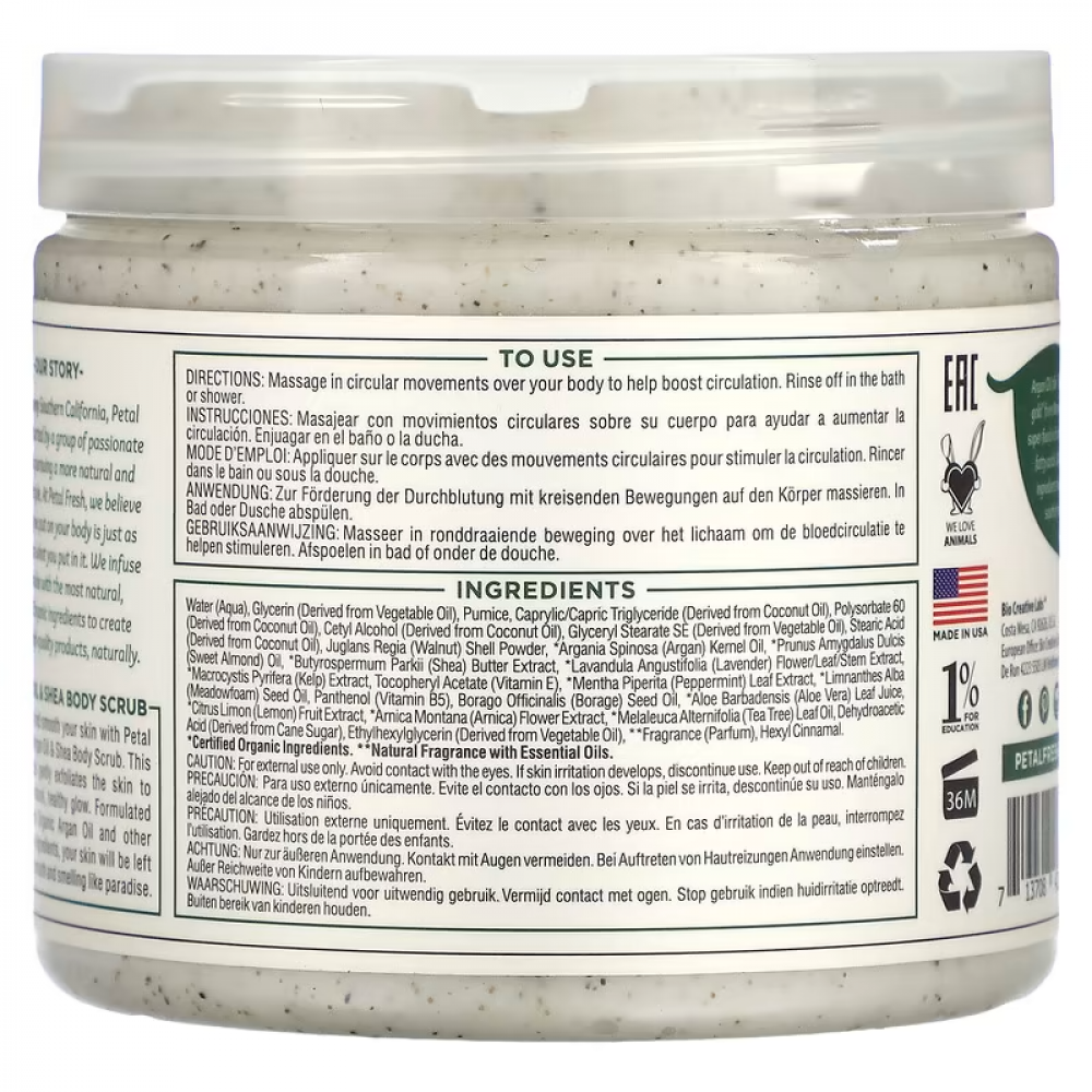 - حبيبات التقشير: يحتوي مقشر الجسم على حبيبات طبيعية للتقشير تقوم بإزالة الخلايا الميتة والشوائب بلطف، مما يساعد على تحسين مظهر البشرة وجعلها أكثر إشراقًا.