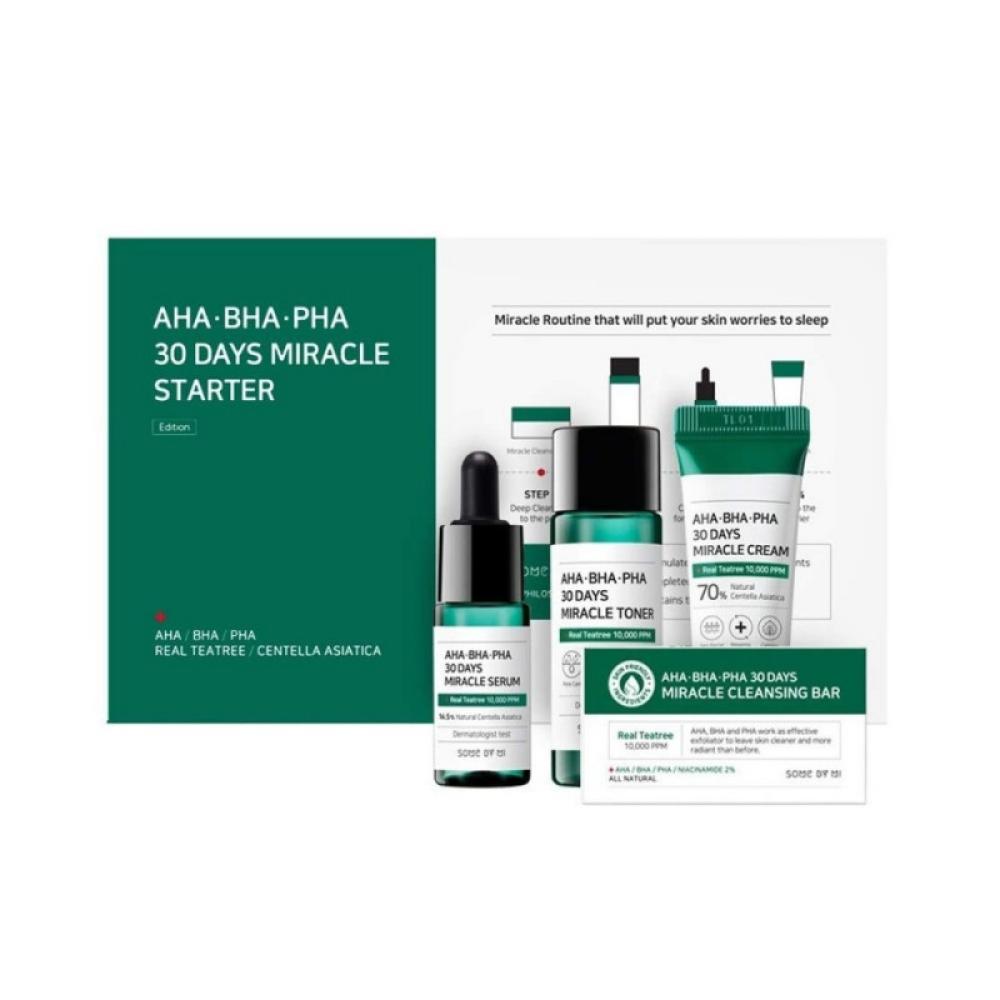 مجموعة مكونة من أربع منتجات من مجموعة المعجزة الكورية بأحجام تجريبية لتوفر لك خطوات عناية متكاملة في البشرة المعرضة للحبوب، تحتوي منتجات المعجزة على أحماض التقشير الطبيعية (ألفا، بيتا، وبولي هيدروكسي أسد) والتي تعمل على تنظيف البشرة والمسام بعمق وعلاج مسببات حب الشباب مثل الشوائب، الأوساخ، الخلايا الميتة، والدهون الزائدة. كما تحتوي على مكونات نباتية كورية طبيعية تساعد على تهدئة البشرة المتضررة، ترطيبها، وتقوية حاجز الحماية الطبيعي، مكونة من صابونة تنظيف، تونر، سيروم، وكريم المعجزة. صنع في كوريا