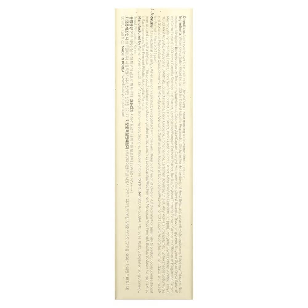 ماء, خلاصة الأرز (أوريزا ساتيفا) (30%), ثنائي بيوتيل الأديبات, بروبانيديول, ثنائي إيثيل أمينو هيدروكسيبنزويل هيكسيل بنزوات, متعدد ميثيل سيلسيسكوكسان, إيثيل هكسيل تريازون, نياسيناميد, مكرر-بنزو ثلاثي أزوليل الميثيلين رباعي ميثيل بوتيلفينول, كوكو-كابريلات/كابرات, كابريليل ميثيكون, ثنائي إيثيل هكسيل بوتاميدو تريازون, جليسرين, بوتيلين جليكول, خلاصة جنين الأرز (أوريزا ساتيفا) (1,000 جزء في المليون), خلاصة أوراق الكاميليا الصينية (كاميليا سينينسيس), خلاصة خميرة البكتيريا الملبنة/اليقطين, خلاصة خميرة الباسيلوس/فول الصويا, خلاصة قصب السكر (ساكاروم المخزني), خلاصة طحلب الكلب العملاق (ماكروسيستيس بيريفيرا), خلاصة ثمار جوز الهند (كوكوس نوسيفيرا), خلاصة جذور الجينسينج الصيني (جينسينج باناكس), موناسكوس/خميرة الأرز (0.12 جزء في المليون), بنتيلين جليكول, كحول البيهينيل, متعدد c 10-30 الألكيل أكريليت, عديد جليسريل-3 ميثيل جلوكوز ثنائي الاستيرات, ديسيل جلوكوسيد, تروميثامين, كربومير, أكريلات/c10-30 الألكيل أكريليت كروسبوليمير, 1،2 هكسانيديول, جلوتامات ستيرويل الصوديوم, أكريلات كروسبوليمير متعدد-6, إيثيل هكسيل جليسرين, أدينوسين, صمغ زنتان, توكوفيرول, خميرة البكتيريا الملبنة/الأرز (0.12 جزء في المليون), خميرة فطر الرشاشيات, ترشيح تخمر السكيراء/الأرز (0.12 جزء في المليون).