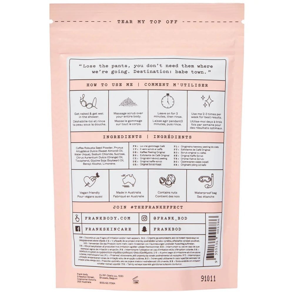 فرانك بودي مقشر القهوة الأساسي تعرف على مقشر القهوة الأصلي والطبيعي 100٪ ، و المستعد للعمل السحري على البثور و الندبات و السيلوليت وعلامات التمدد و يحافظ على بشرتك تبدو مرحة و متساوية و ناعمة للغاية.