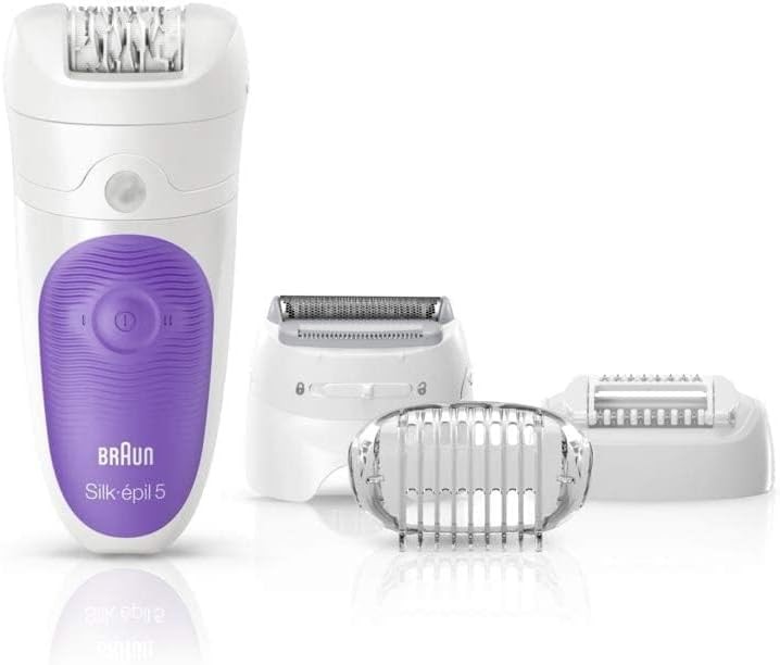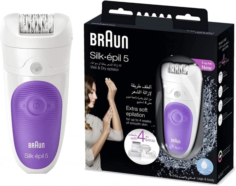 آلة إزالة الشعر Silk-épil 5 5-541 اللاسلكية من براون للاستخدام الجاف أو مع الماء ذات 4 ملحقات تشمل رأس ماكينة الحلاقة وغطاء أداة تهذيب الشعر - آلة إزالة الشعر Silk-épil 5 من براون. آلة إزالة الشعر بالغة الرقة واللطف للاستخدام تحت الماء أو الاستخدام الجاف لبشرة ناعمة لمدة تصل إلى 4 أسابيع