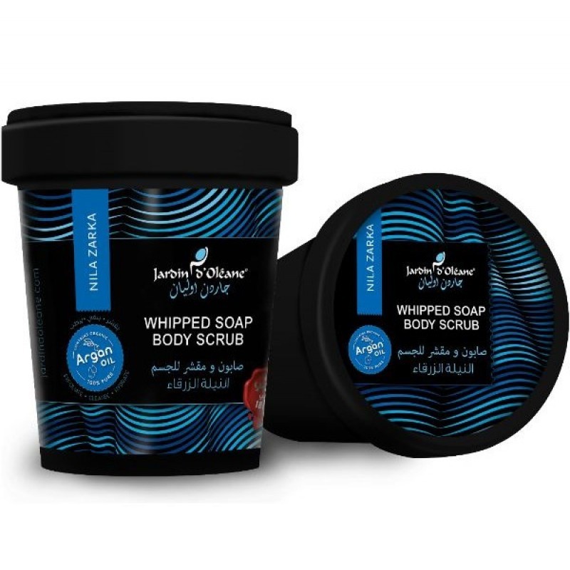 جاردن اوليان صابون ومقشر للجسم بالنيلة الزرقاء هو مزيج لتقشير البشرة الجافة والميتة و سيجعلها تشعر بالرطوبة و يغذيها و هو يستخدم لجميع مناطق الجسم كامل بما فيه الوجه